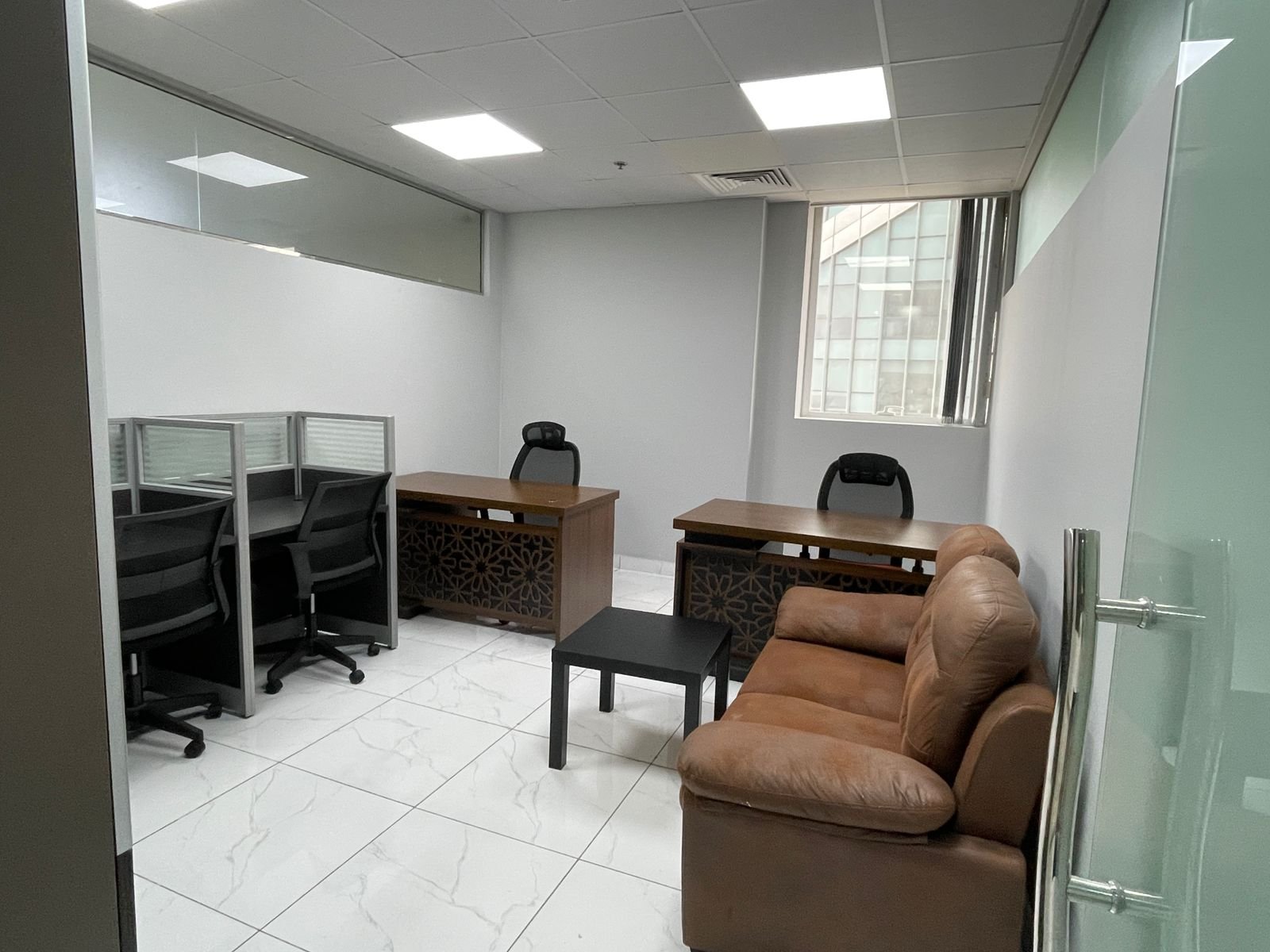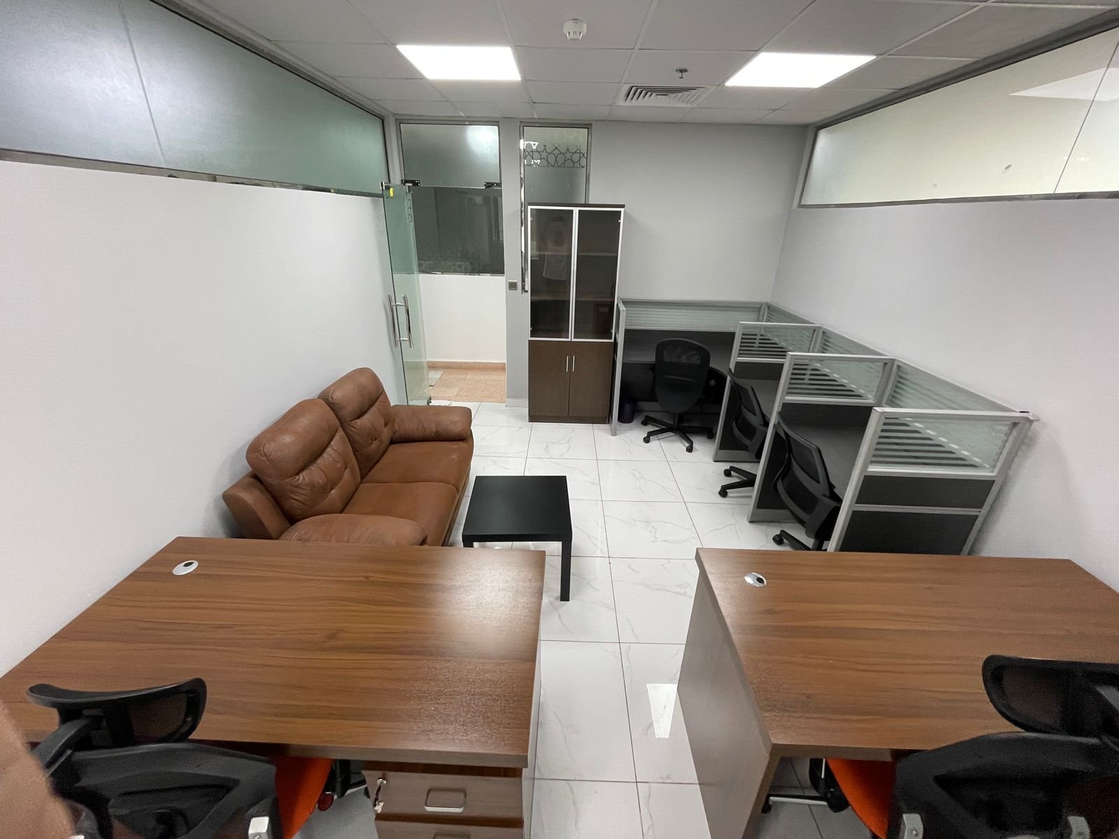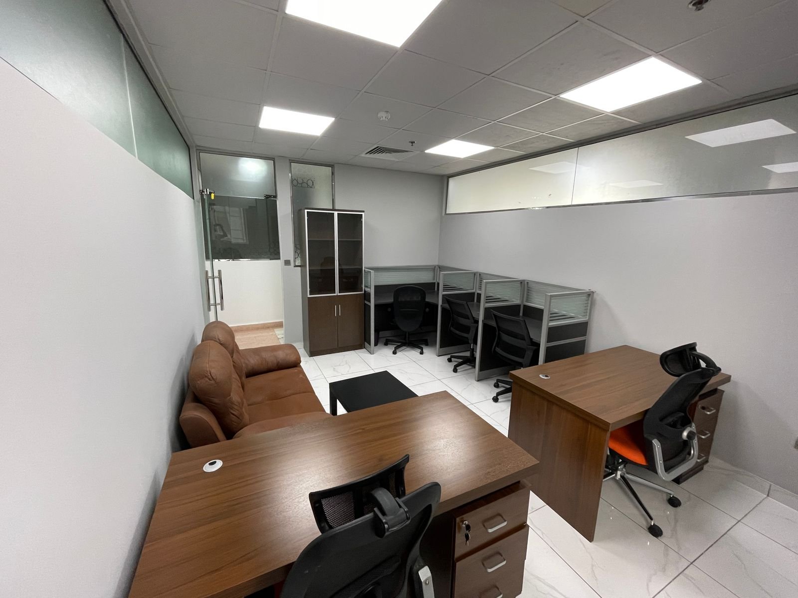 • Layout: Glass-partitioned cabins and meeting rooms