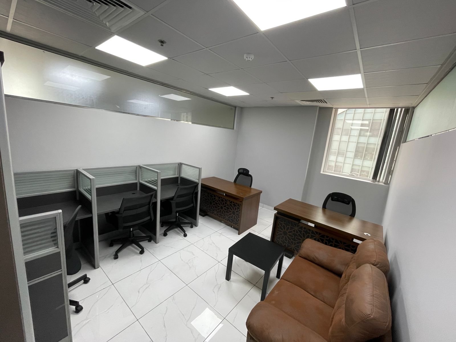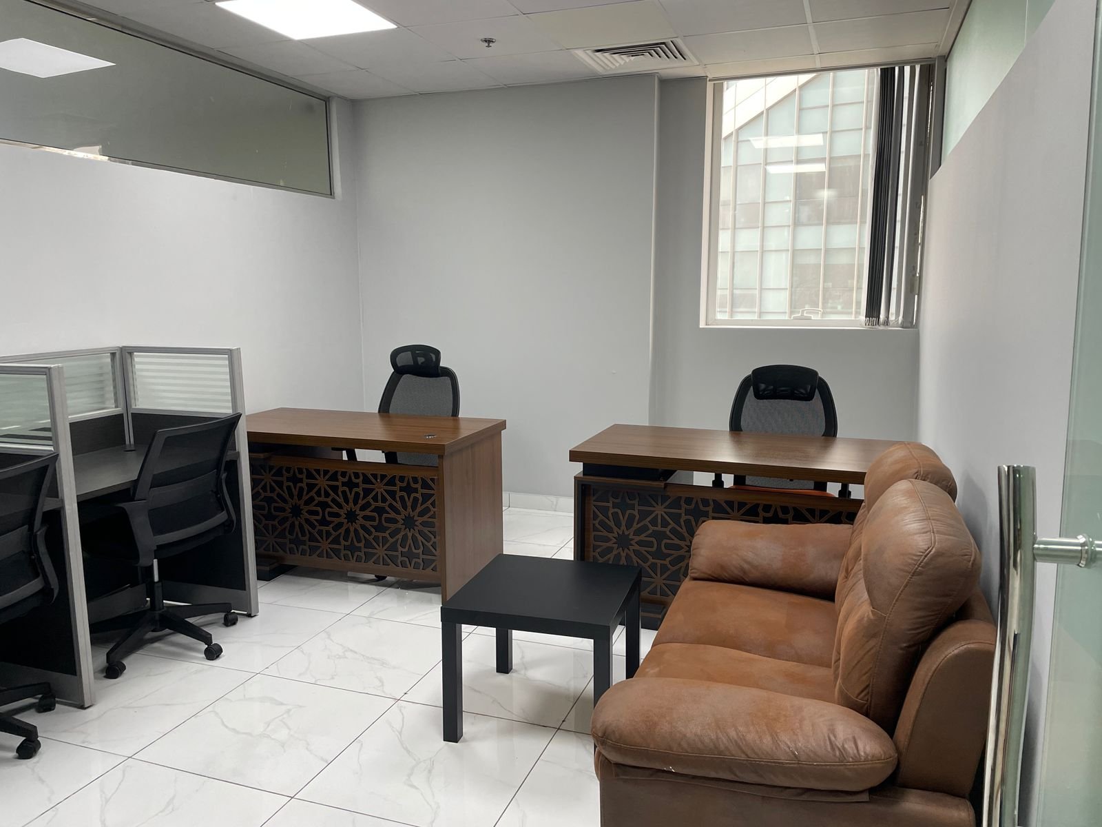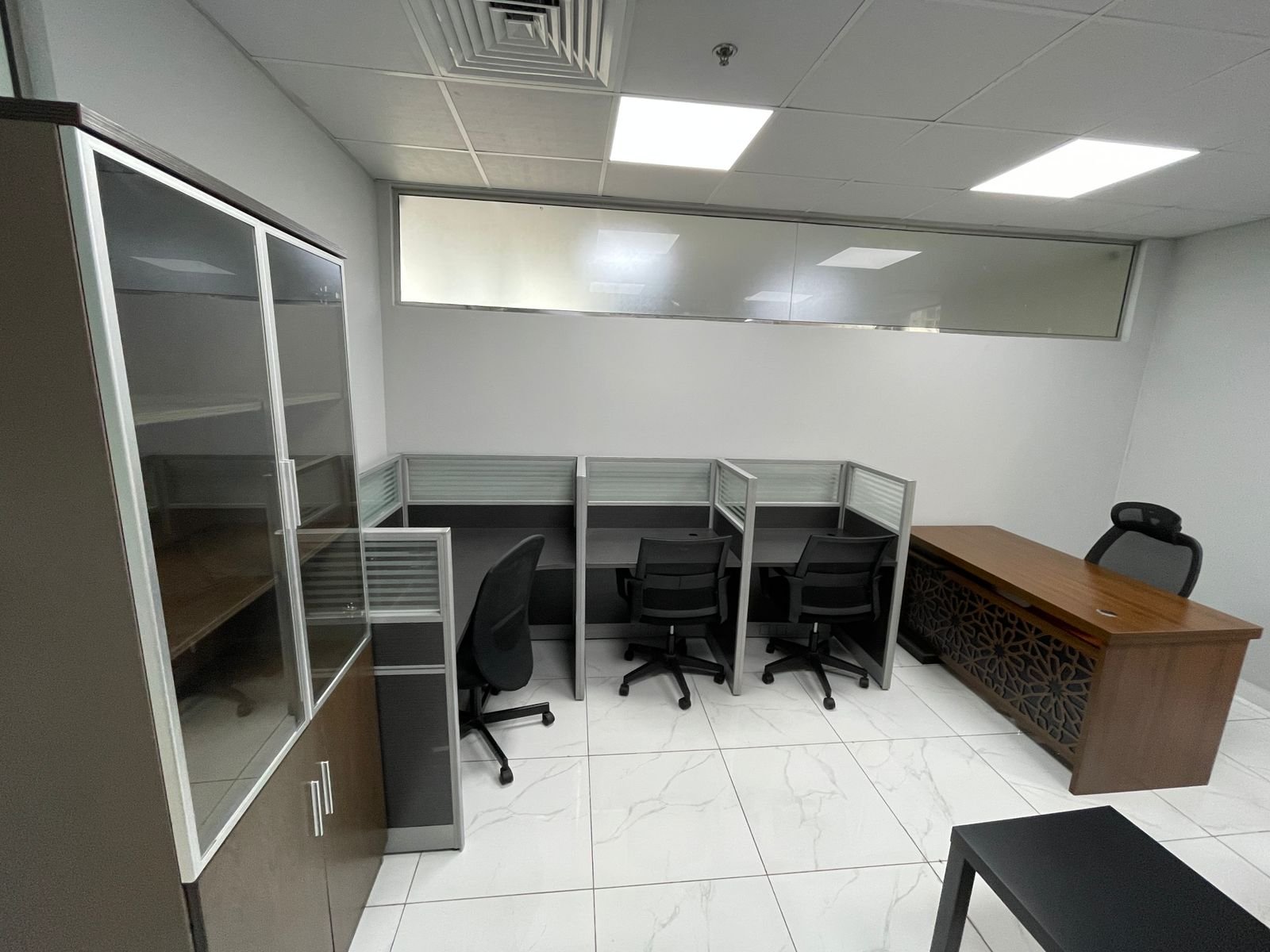 • Layout: Glass-partitioned cabins and meeting rooms