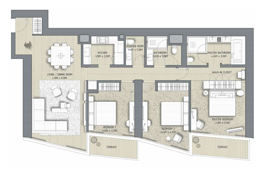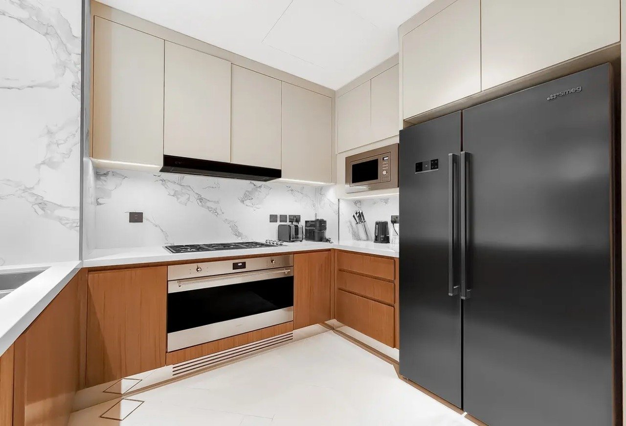 The apartment features a bright and spacious living area, floor-to-ceiling windows, and a private balcony capturing the charm of the iconic Downtown skyline. Each bedroom is elegantly designed with en-suite bathrooms and built-in wardrobes, while the open-plan kitchen is fully equipped with premium appliances and modern finishes — ideal for both family living and entertaining guests.